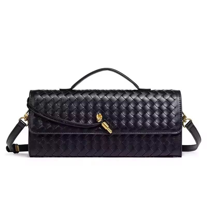 Elegant woven clutch bag featuring sleek gold hardware, designed for both casual outings and special occasions.